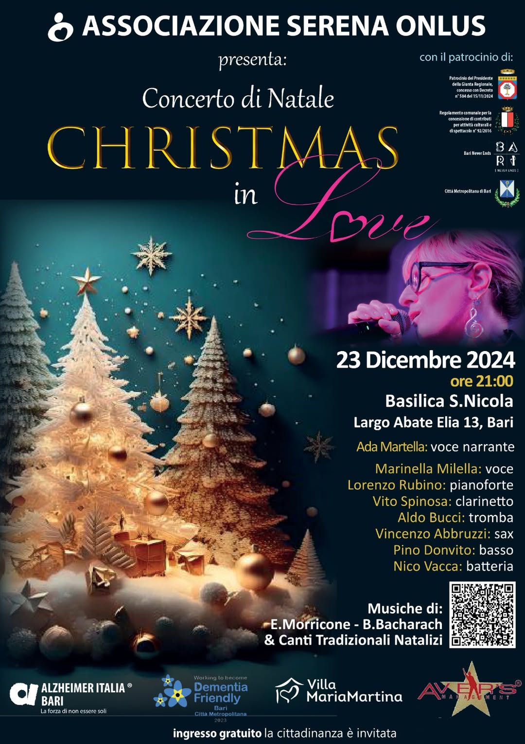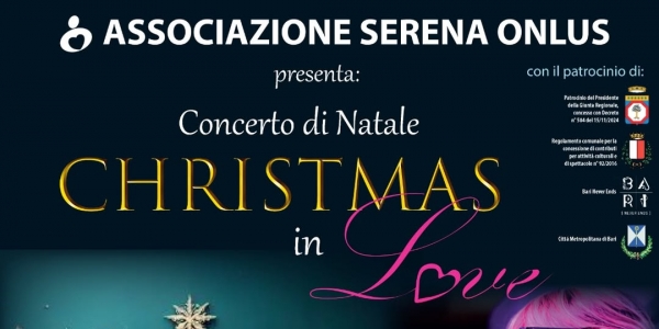 "CHRISTIMAS IN LOVE" è il titolo del Concerto di Natale organizzato dall'Associazione Serena Onlus di Bari con la collaborazione dell'Associazione Alzheimer Bari il 23 dicembre 2024 alle ore 21,00 presso la Basilica di San Nicola, patrocinato dalla Regione Puglia, Comune di Bari e Città Metropolitana. La vocalist Marinella Milella sarà accompagnata dall'elegante supporto musicale dei maestri Lorenzo Rubino al pianoforte, Aldo Bucci alla tromba, Vito Spinosa al clarinetto, Vincenzo Abbruzzi al sax e Nico Vacca alla batteria. Il concerto è ispirato alle più belle melodie della tradizione natalizia americana e a celebri composizioni di autori tra i quali Morricone e Bacharach. Un appuntamento imperdibile per festeggiare il Natale con l'emozione e la magia della musica. Concerto gratuito aperto a tutta la cittadinanza.